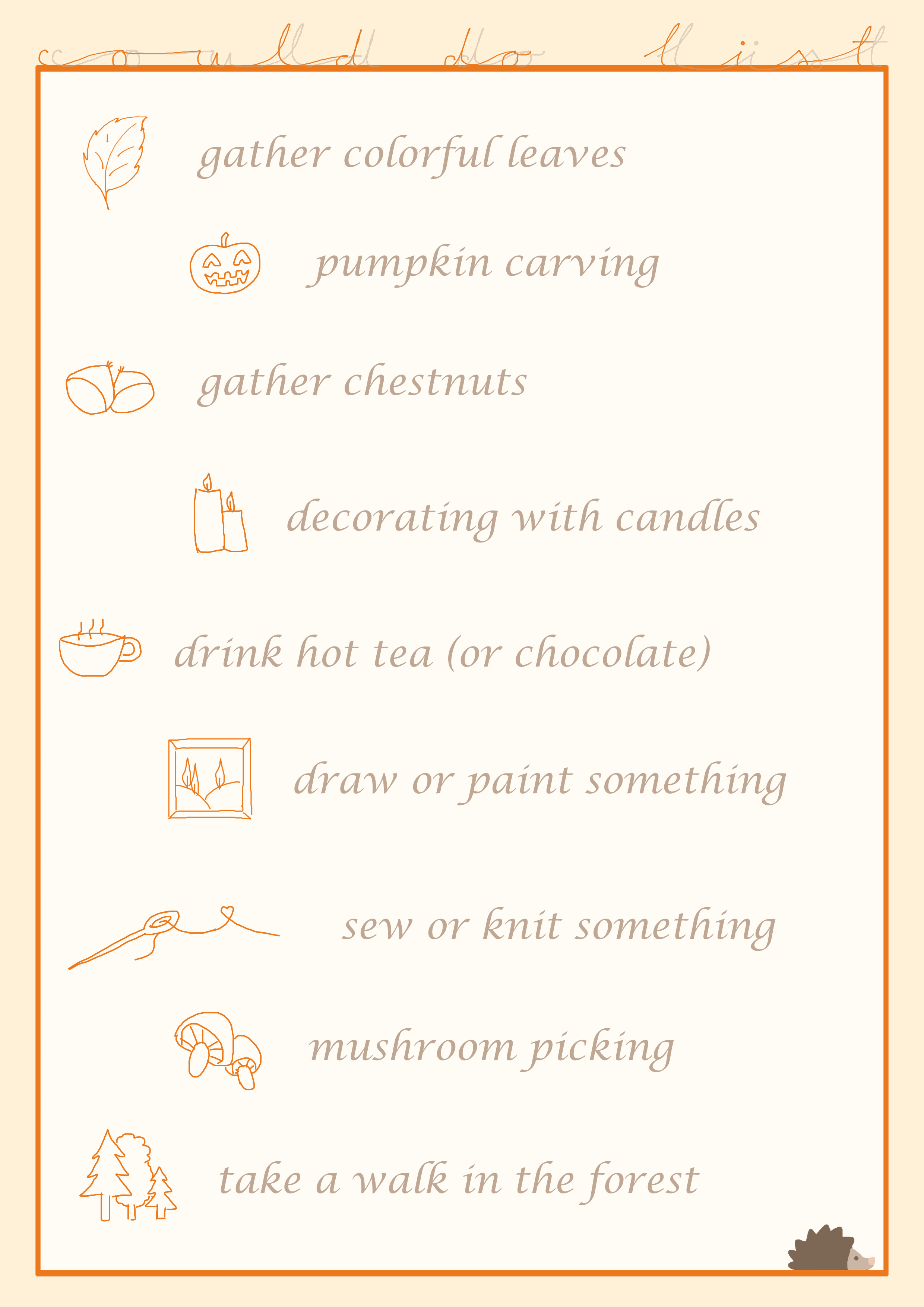You can download the templates below for your Could-Do-List for Autumn. In the first list, there are suggested activities for autumn. The second list is empty. If you’ve completed a task, you can colour the corresponding item.